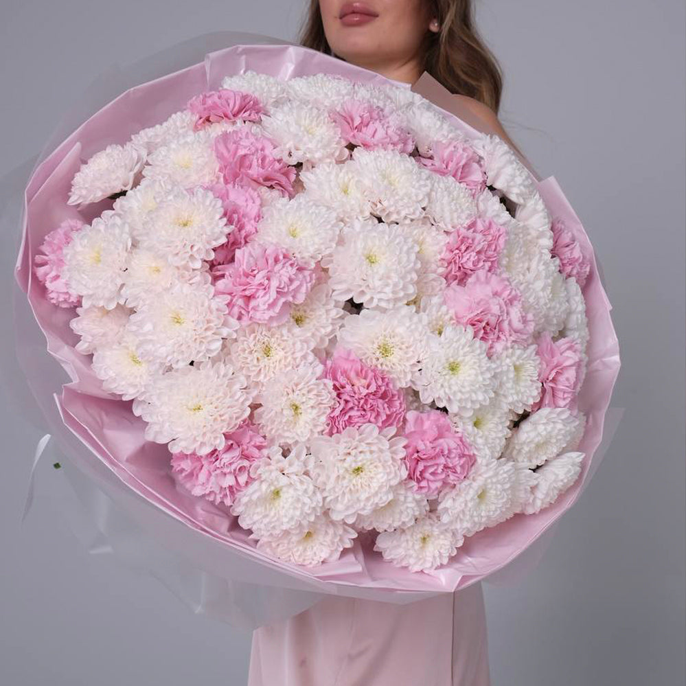 A bouquet of 20 pink carnations and 10 white chrysanthemum, depending on size selected. With...