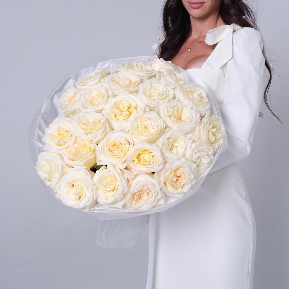 A bouquet of 24 or 48 white Garden roses and eucalyptus, depending on size selected....