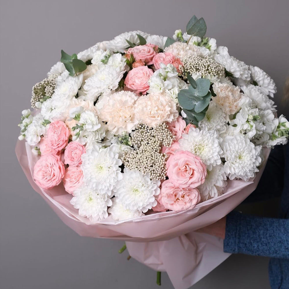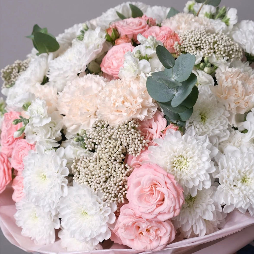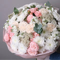 A bouquet of 10 pink spray roses, 10 white stock flower, 10 white chrysanthemum, 7 peach carnations, 3 rice flower and eucalyptus.