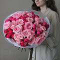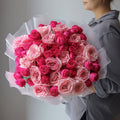 A bouquet of 20 pink roses and 10 hot pink spray roses.