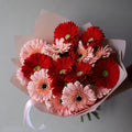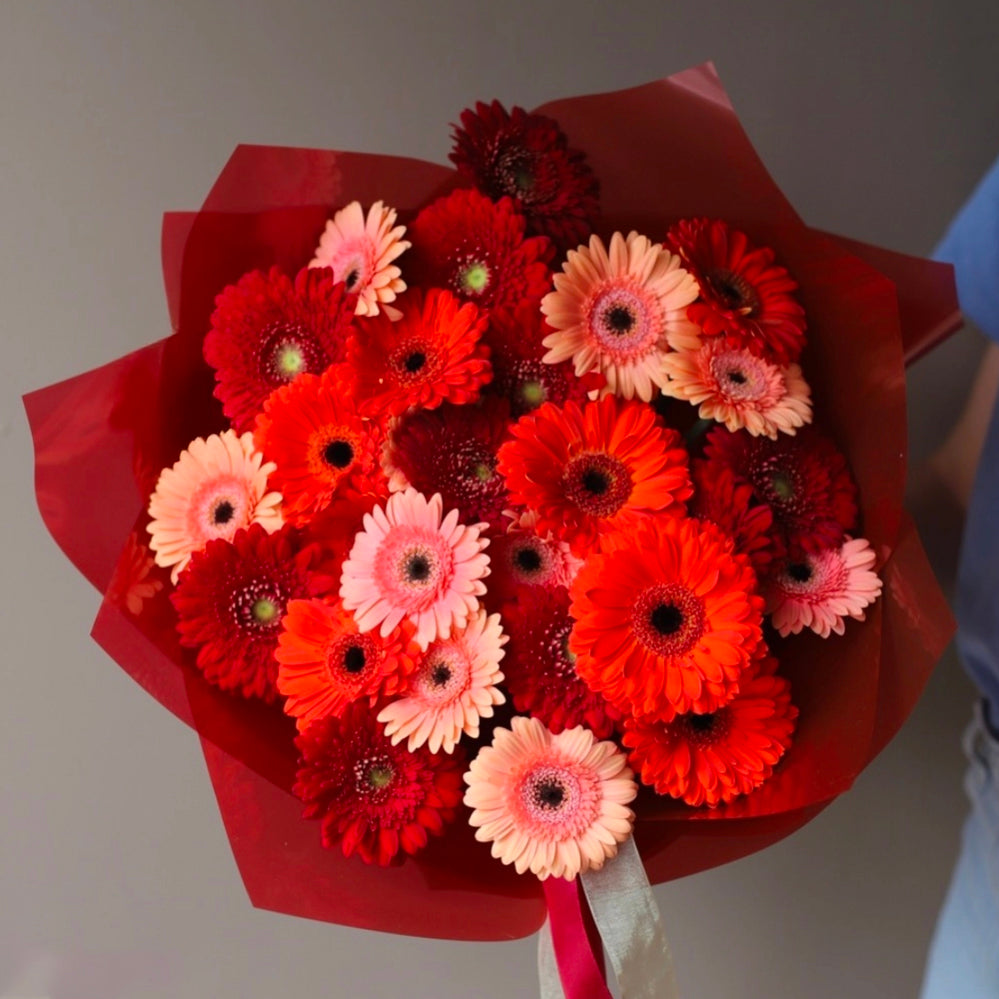 A bright bouquet of 20 or 30 gerberas and greenery.
