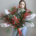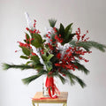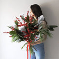Winter bouquet of ilex berries, pine tree, snow-covered branches, and magnolia branches.