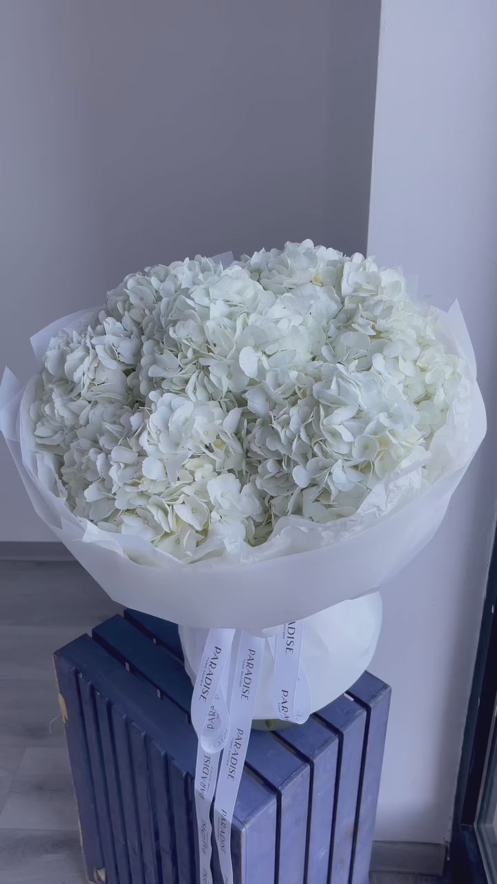 A luxurious mono-bouquet of white hydrangeas, depending on selected size.