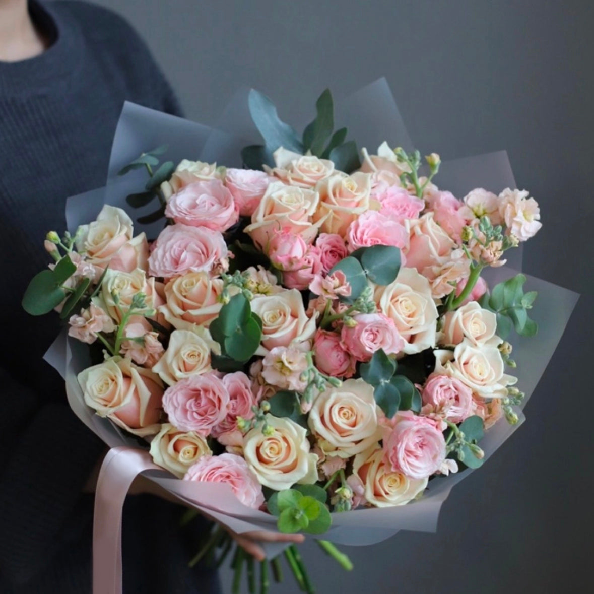 A bouquet of roses, spray roses, stock flower, and eucalyptus.