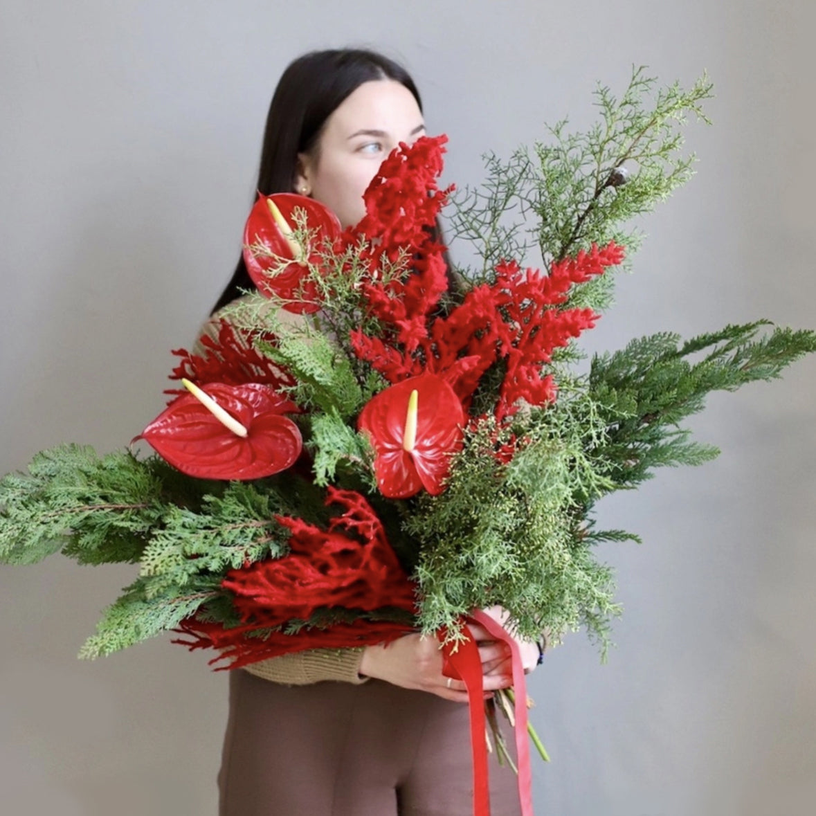 Winter bouquet of juniper tree, red-covered branches, and 3 stems of red anthurium.