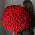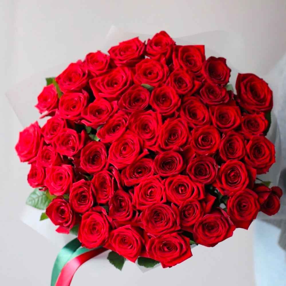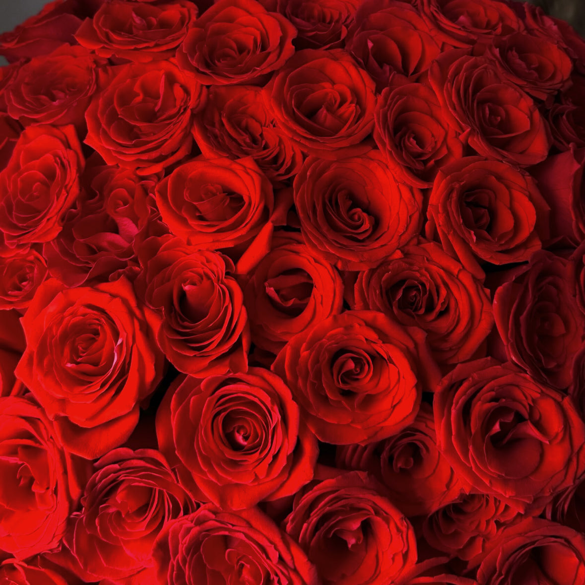 A bouquet of 24 or 50 or 100 roses, depending on size selected.