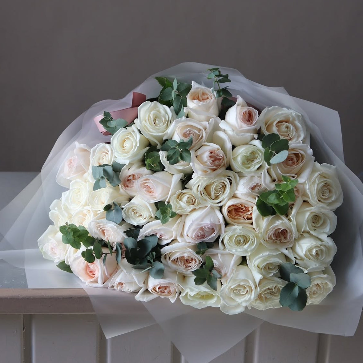 A bouquet of 24 or 48 white Garden roses and eucalyptus, depending on size selected.