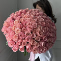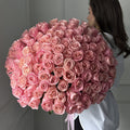 A bouquet of 24 or 50 or 100 roses, depending on size selected.